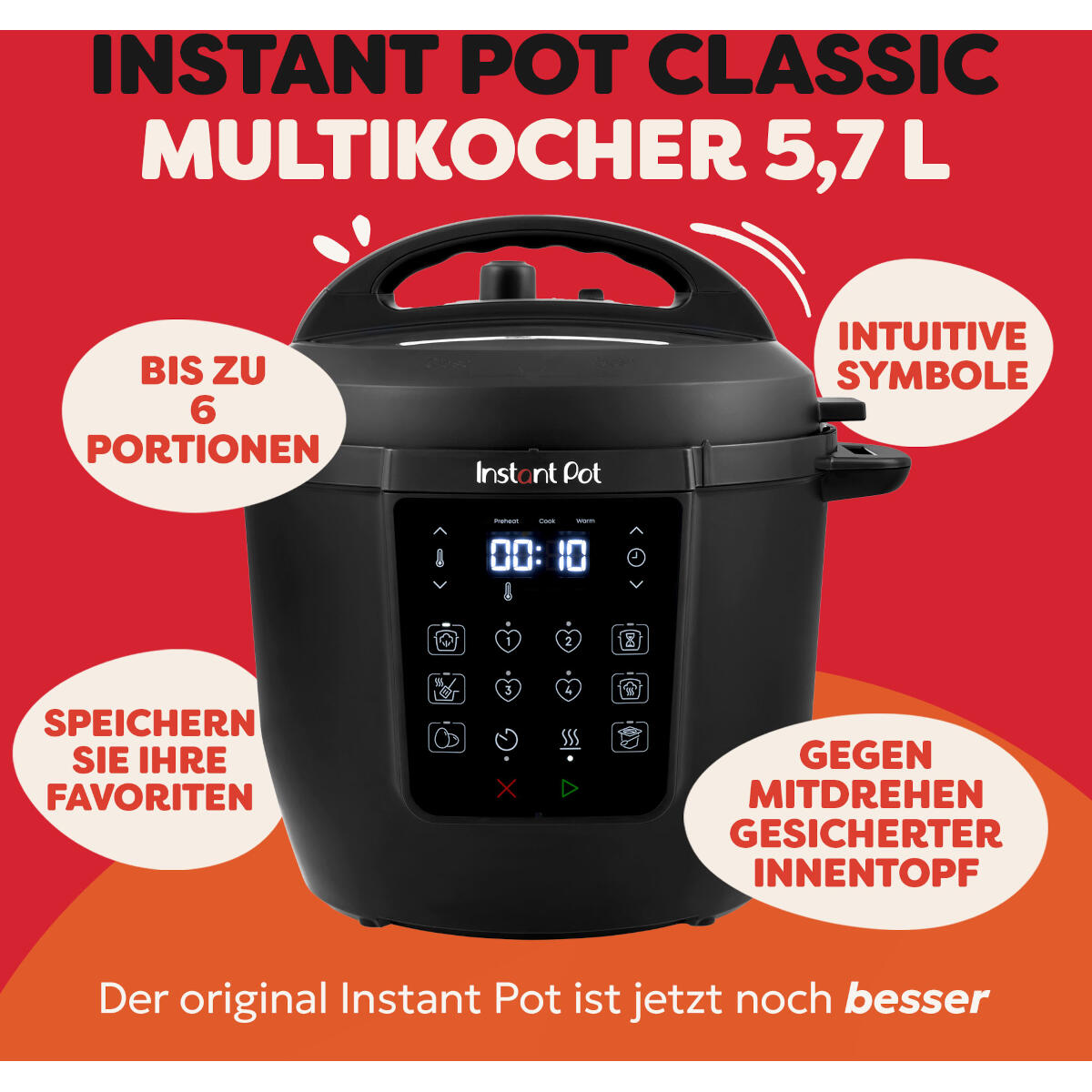 - 7-in-1-Funktionalität : Der Instant Pot 5,7-l-Multikocher (RIO) ist ein Alleskönner mit Schnellkochtopf, Bratpfanne, Schongarer, Dämpfen, Joghurt-, Eier- und Warmhaltefunktion. Egal, ob Sie eine schnelle Mahlzeit unter der Woche oder ein Abendessen mit der Familie planen, der Instant Pot 5,7 l Multicooker (RIO) ist für Sie da.