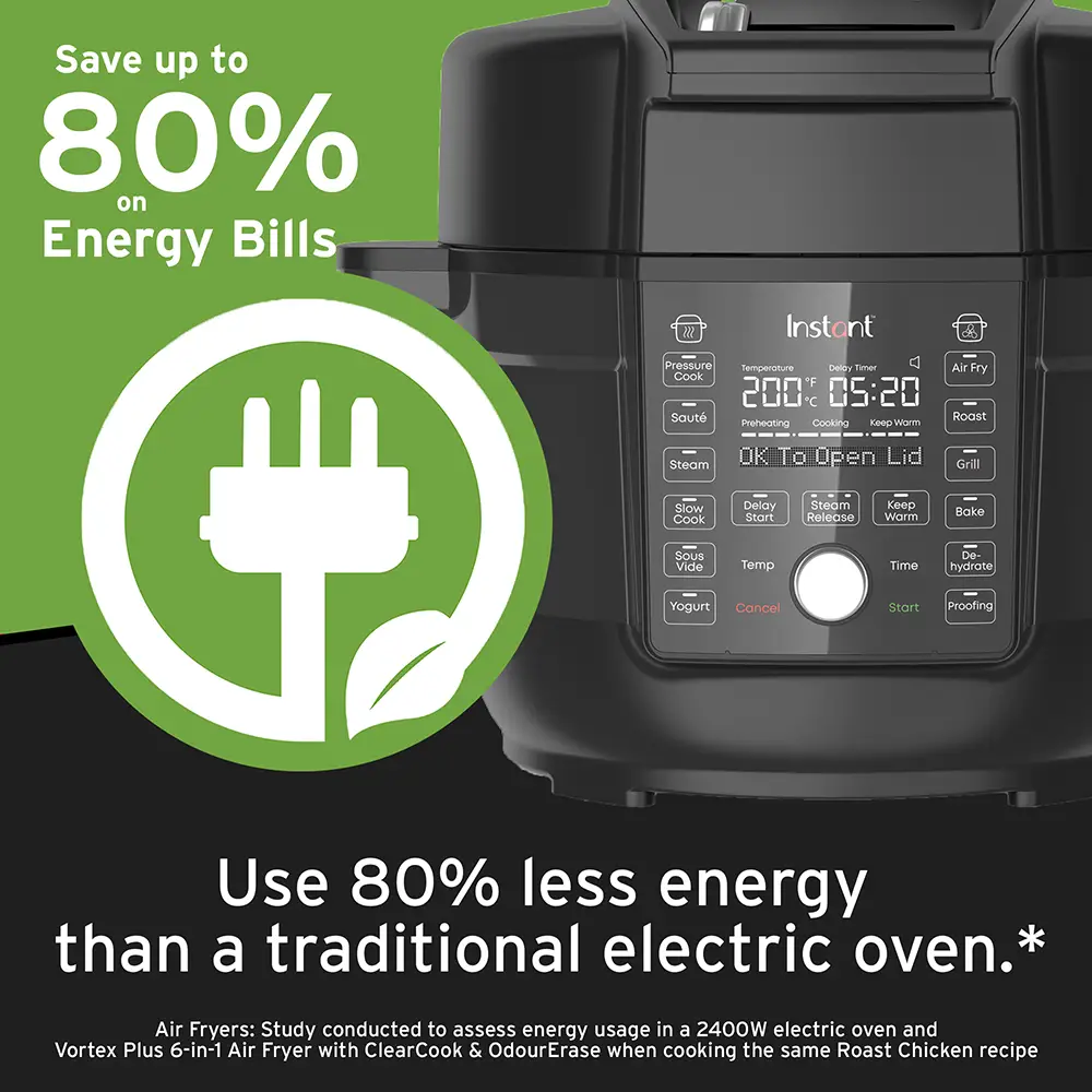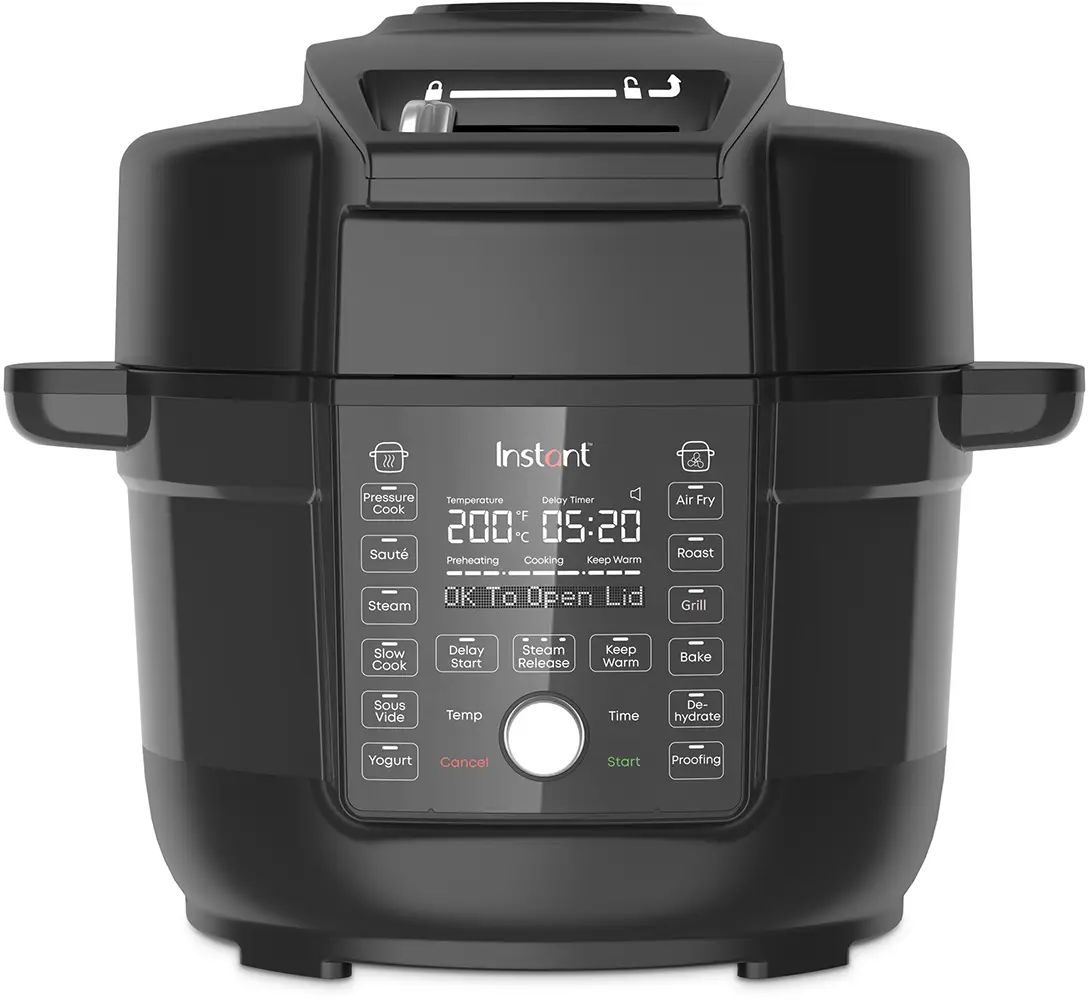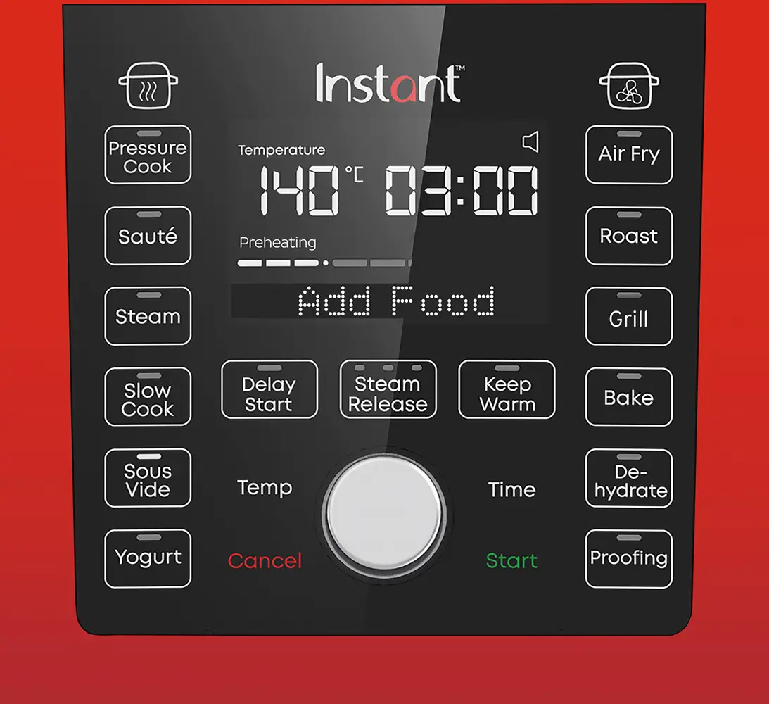 - 13-IN-1: Schnellkochtopf, Heißluftfritteuse, Schongarer, Dampfgarer, Sautierpfanne, Speisenwärmer, Bräter, Mini-Backofen, Grill, Dörrgerät, Joghurtbereiter, Sous-Vide und Brotaufgehen
