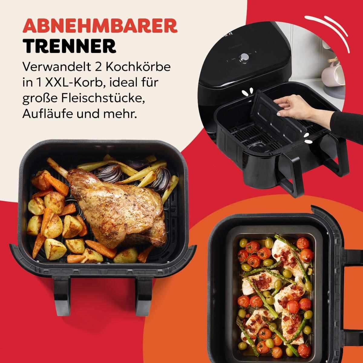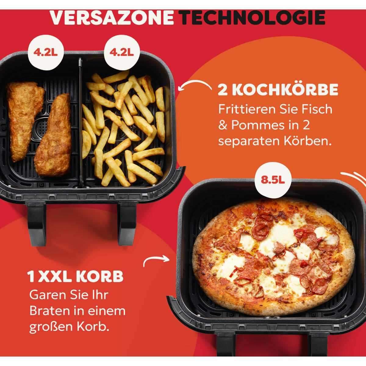 - 2-in-1 Schublade: Bereiten Sie eine komplette Familienmahlzeit in einer einzigen 8,5L Zone zu oder teilen Sie sie in 2 x 4,2L Zonen auf für Ihr Freitags-Fisch und Pommes, mit separaten Bedienelementen für jede Zone.