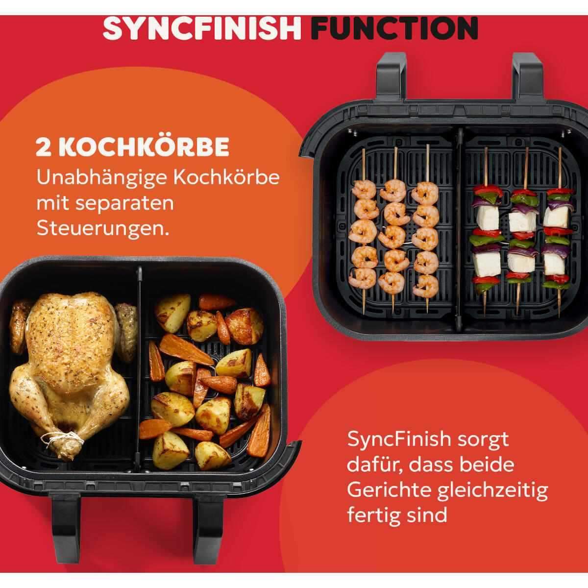 Verwenden Sie ihn als großen Einzelkorb mit 8,5L Fassungsvermögen, wenn Sie eine große Familienmahlzeit oder ein großes Stück Fleisch zubereiten möchten. Oder wechseln Sie zu zwei 4,2L Körben mit dem praktischen Trenner und bereiten Sie zwei separate Gerichte gleichzeitig zu! Genießen Sie Ihr Freitags-Fisch und Pommes oder probieren Sie eine vegane und eine Fleischversion desselben Gerichts aus. Mit der intelligenten SyncCook-Funktion können Sie die Kochzeiten und -einstellungen automatisch zwischen den Körben abstimmen. Oder verwenden Sie SyncFinish, um sicherzustellen, dass beide Körbe gleichzeitig fertig sind! Und wenn Sie nur eine kleine Portion zubereiten möchten, verwenden Sie einfach einen Korb! Sparen Sie Energie und Lebensmittel - kochen Sie, was Sie essen!