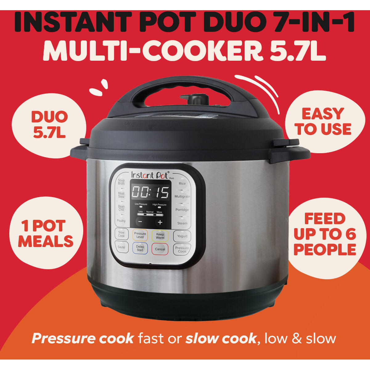 The Instant Pot Duo 7-in-1 comes in three convenient sizes to fit the way you cook: 3L, 5.7L, and 8L. All sizes come with 13 standard one-touch Smart Program presets: Soup/Broth, Meat/Stew, Beans/Chilli, Slow Cook, Sauté, Rice, Porridge, Steam, Yogurt, Keep Warm, and Pressure Cook, while the 5.7L and 8L Duo have two additional programs: Multigrain and Poultry. And because the Duo is an Instant Pot, you know it delivers all the quality and convenience that the Instant Pot name has made synonymous with multi-cookers.