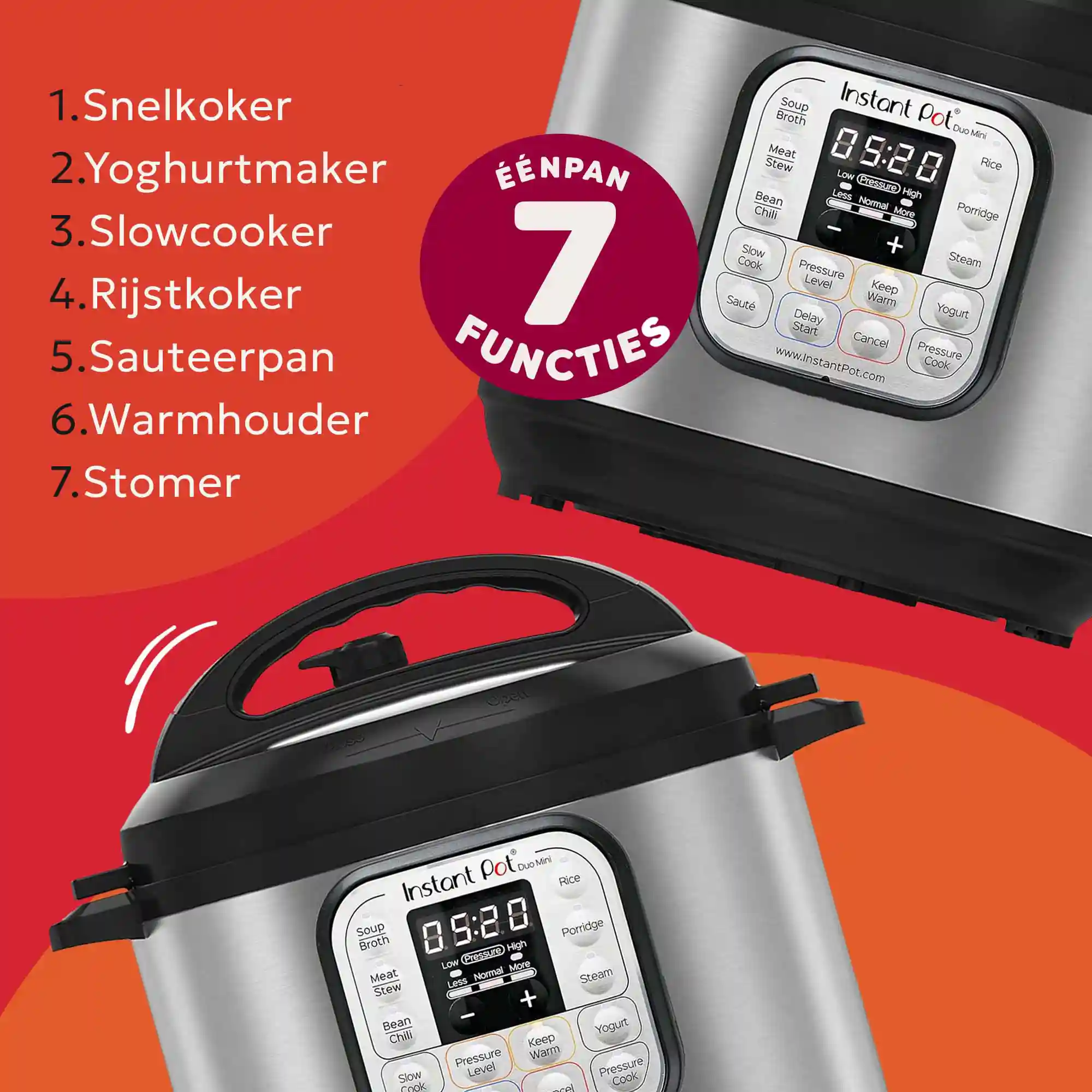 Instant Pot Duo 3L Mini multicooker, roestvrijstalen binnenpan, stoomrek zonder handvatten, handleiding Engels (Nederlands digitaal verkrijgbaar).
