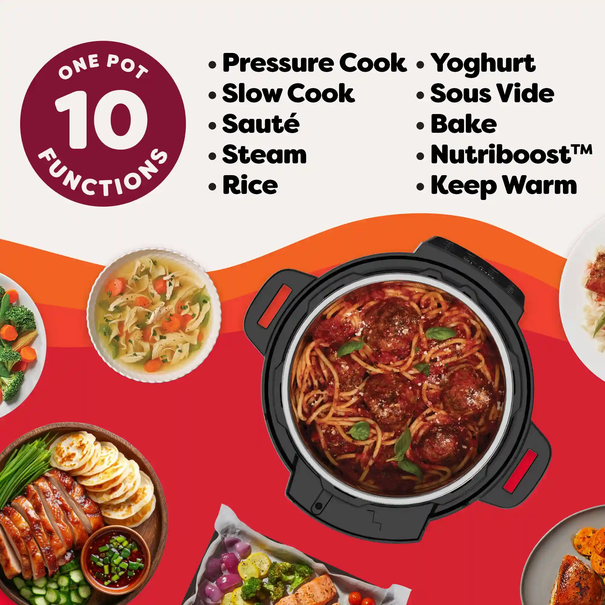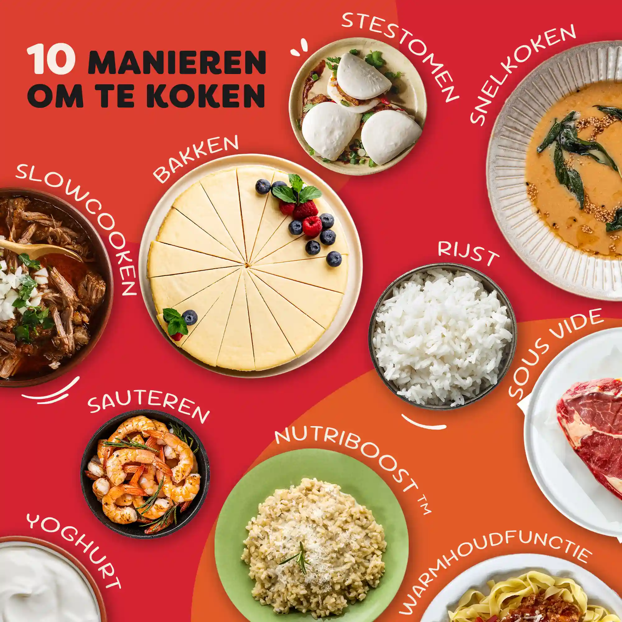 - 10-in-1 functionaliteit: de Instant Pot Pro Multicooker functioneert als snelkookpan, slowcooker, sous-vide, braadpan, rijstkoker, sterilisator, yoghurtmaker, voedselverwarmer, cakemaker en stomer, waardoor meerdere keukenapparaten in één zijn gecombineerd.