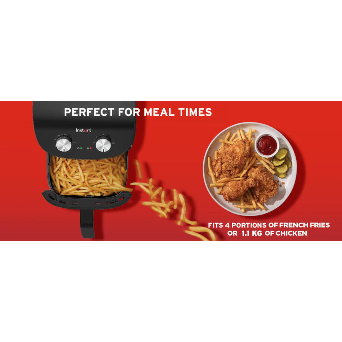 - Compact maar krachtig: Voldoende ruimte voor maximaal 4 porties friet, een bakvorm van 18,5 cm of een hele kip van 1,1 kg.