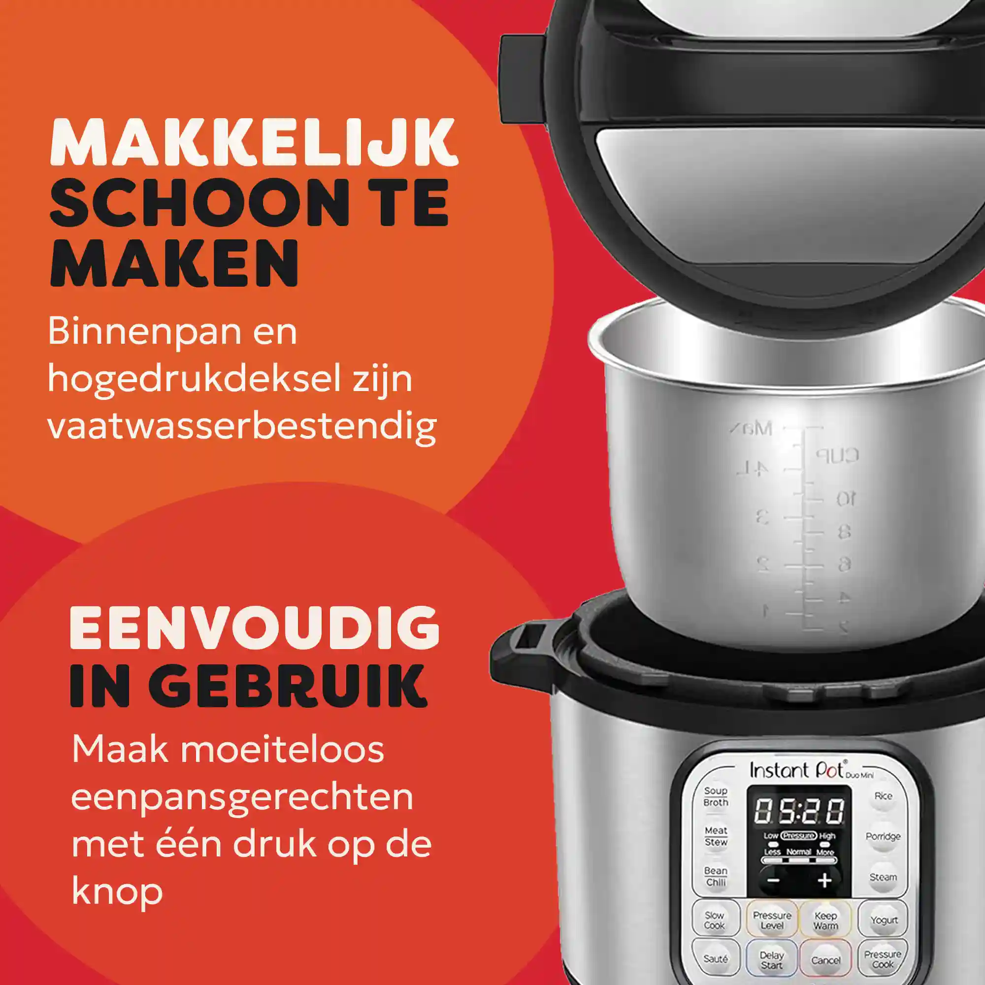De Duo doet alles wat je kunt doen met 7 andere apparaten: snelkookpan, sauteerpan, stomer, slowcooker, rijstkoker, voedselwarmer en yoghurtmaker.