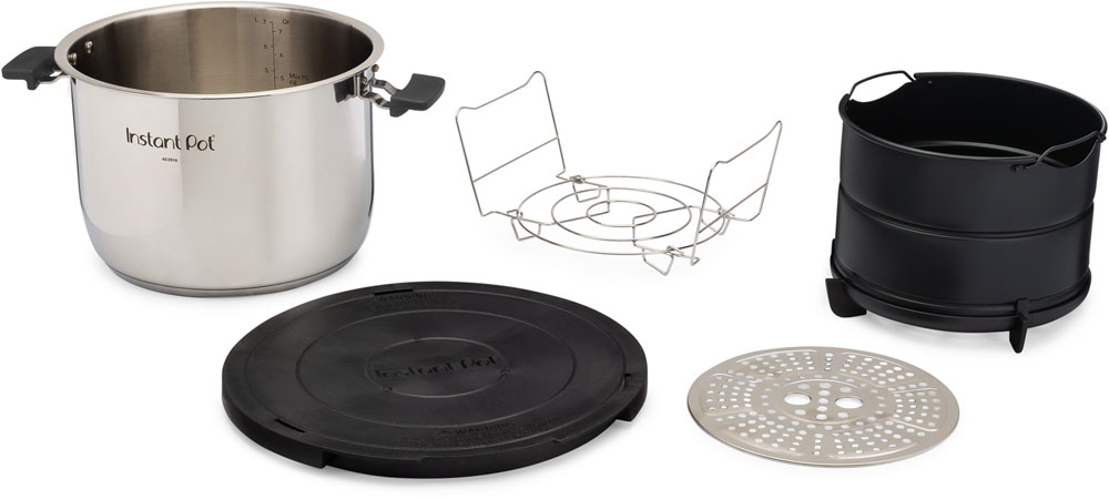 De verbeterde binnenpot is gemaakt van hoogwaardig 304 roestvrij staal (18/8) en heeft siliconen handgrepen voor eenvoudig optillen en verplaatsen, evenals een vlakke, drielaagse bodem voor ultiem schroeien en sauteren. Kook in uw Instant Pot, of doe de binnenpot in een elektrische, keramische, gas- of inductiekookplaat, of in een oven ingesteld op maximaal 456 °F (230 °C), en zet hem vervolgens in de vaatwasser voor een snelle reiniging.