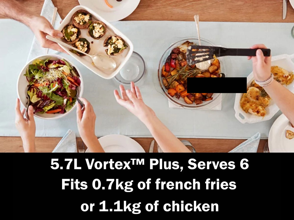 - Groot en gemakkelijk schoon te maken: De capaciteit van 5.7L kan moeiteloos familieporties aan, zoals een sappige kip van 1.8kg of 1kg heerlijke friet.