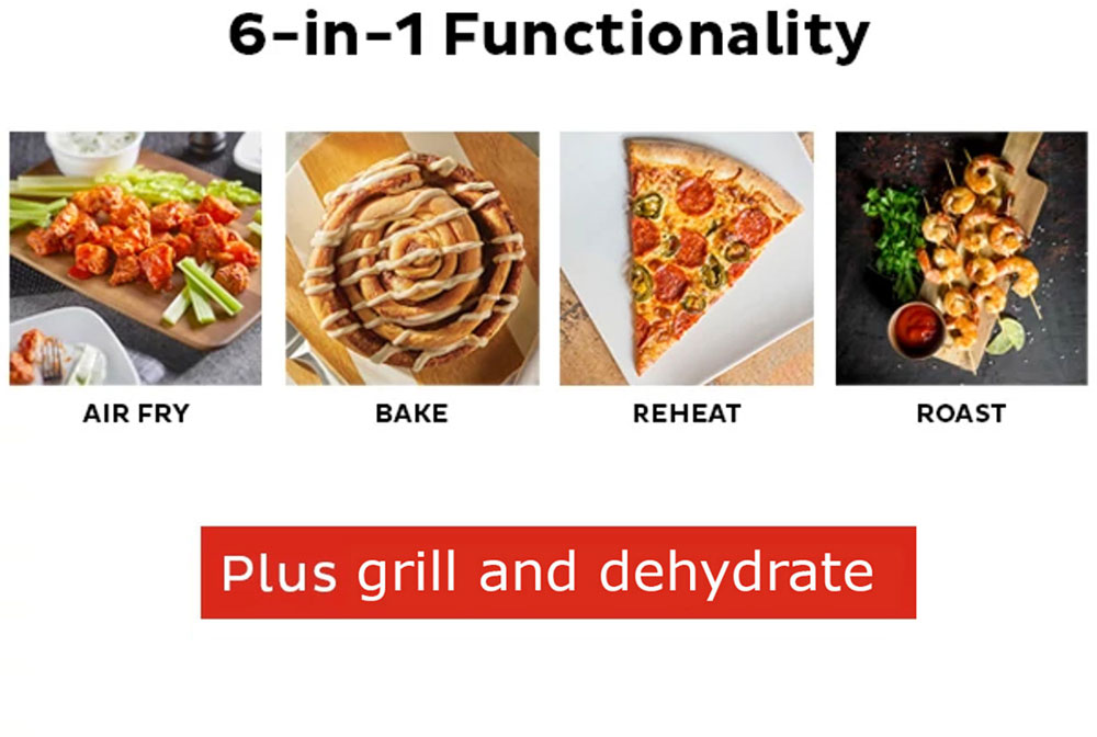 - 6 functies in 1: Airfryen, grillen, bakken, roosteren, dehydrateren en opwarmen.