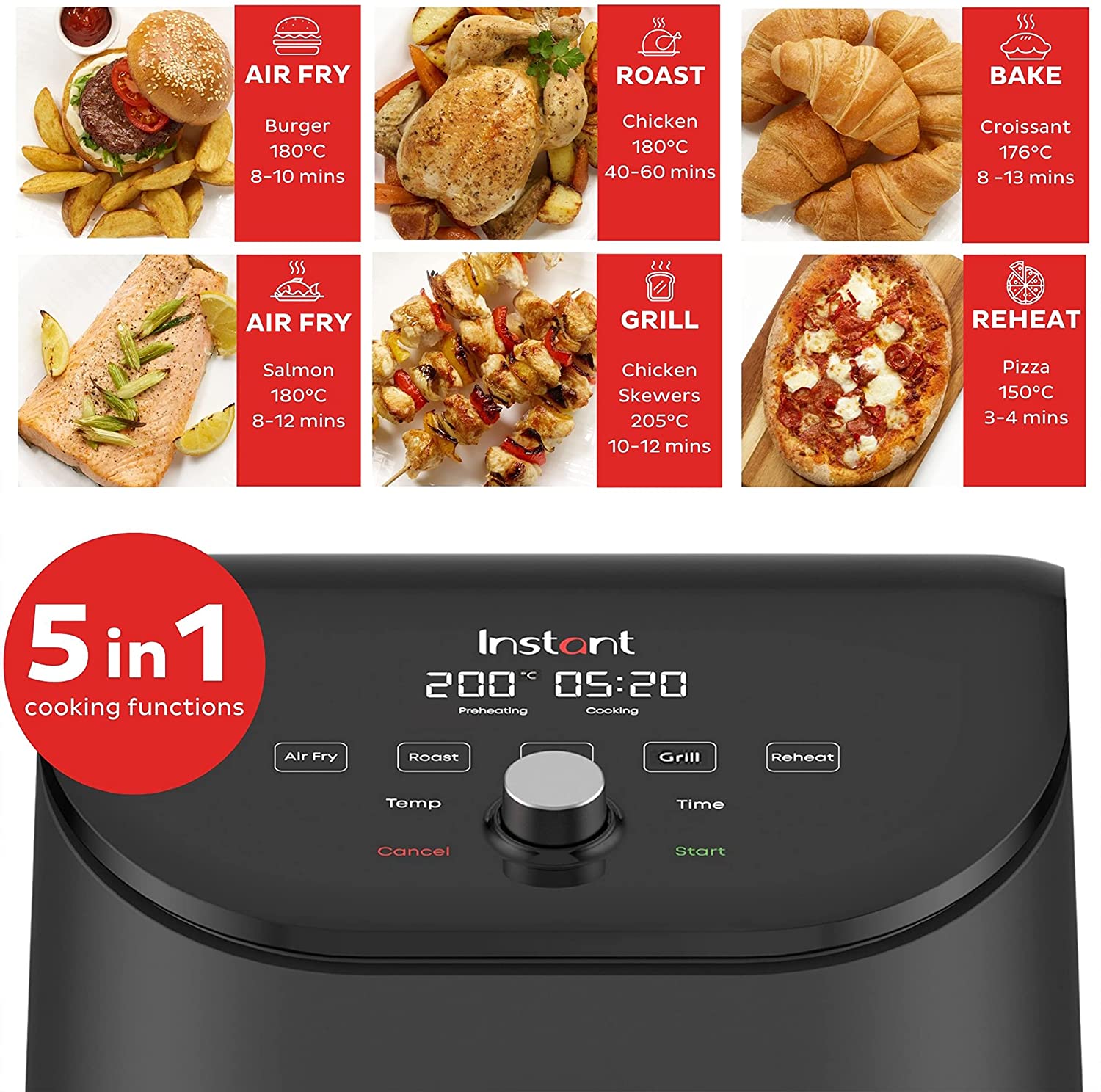 - 5-in-1 functionaliteit: Airfry, braden, bakken, opwarmen en grillen.