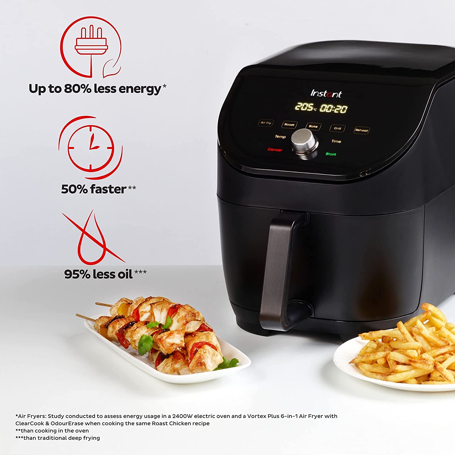 Met zijn ruimtebesparende ontwerp en grotere kookcapaciteit kan deze heteluchtfriteuse tot 1 kg frites, een stukje zalm of zelfs een kip van 1,3 kg bereiden, terwijl hij 20% minder ruimte in beslag neemt in uw keuken. En met tot 50% snellere bereidingstijden dan traditioneel koken in de oven, kunt u uw maaltijden binnen enkele minuten klaar hebben, waardoor u tijd en energie bespaart. De Instant Vortex Slim Airfryer bespaart je niet alleen tijd en energie, maar bespaart je ook geld door het energiezuinige ontwerp. Het verbruikt tot 80% minder energie en kost vergeleken met traditioneel koken in de oven, waardoor het een slimme en duurzame keuze is voor je keuken.